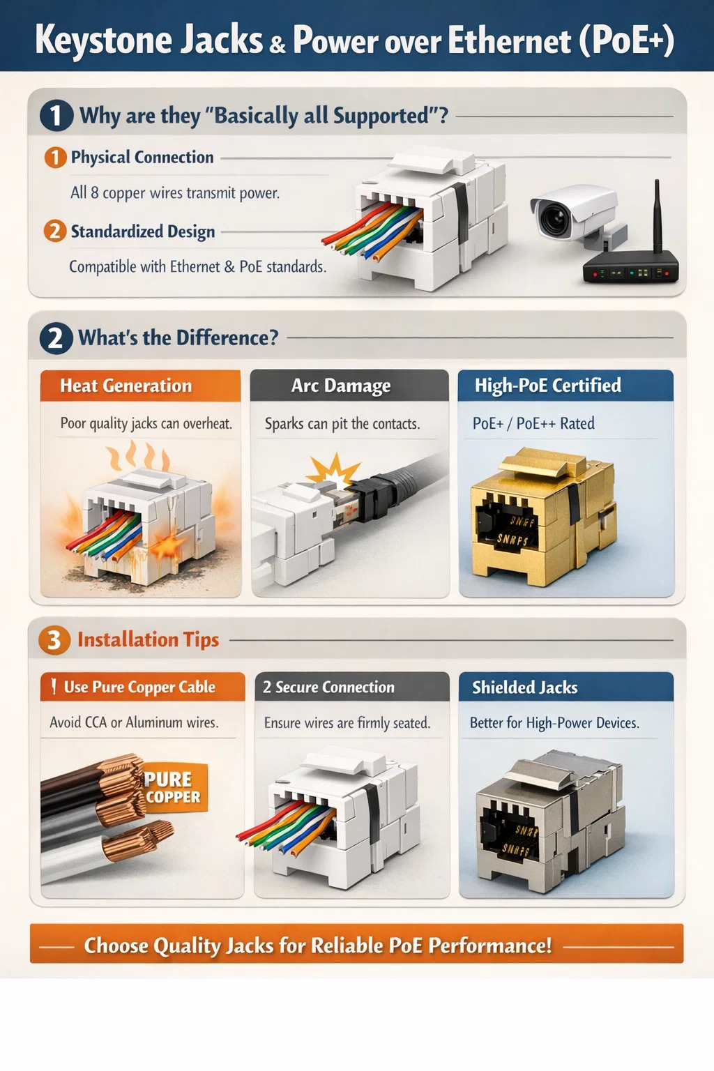 Ang karamihan sa mga karaniwang network cable connectors ( Mga Keystone Jack ) pisikal na sumusuporta sa Power over Ethernet (PoE), ngunit hindi lahat ng produkto ay pantay na maaasahan sa ilalim ng aktwal na operasyong may mataas na karga.