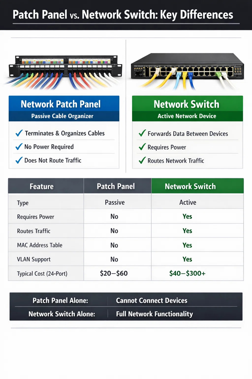 A panel ng patch ng network ay isang tool sa organisasyon para sa structured na paglalagay ng kable. Ito ay ganap na pasibo, hindi nangangailangan ng kapangyarihan, at nagbibigay ng zero na paggana ng network sa sarili nitong. Ang switch ng network ay ang aktibong utak ng iyong wired network — kung wala ito, walang nakikipag-ugnayan. Kailangan mo ng switch kahit na gumamit ka ng patch panel.