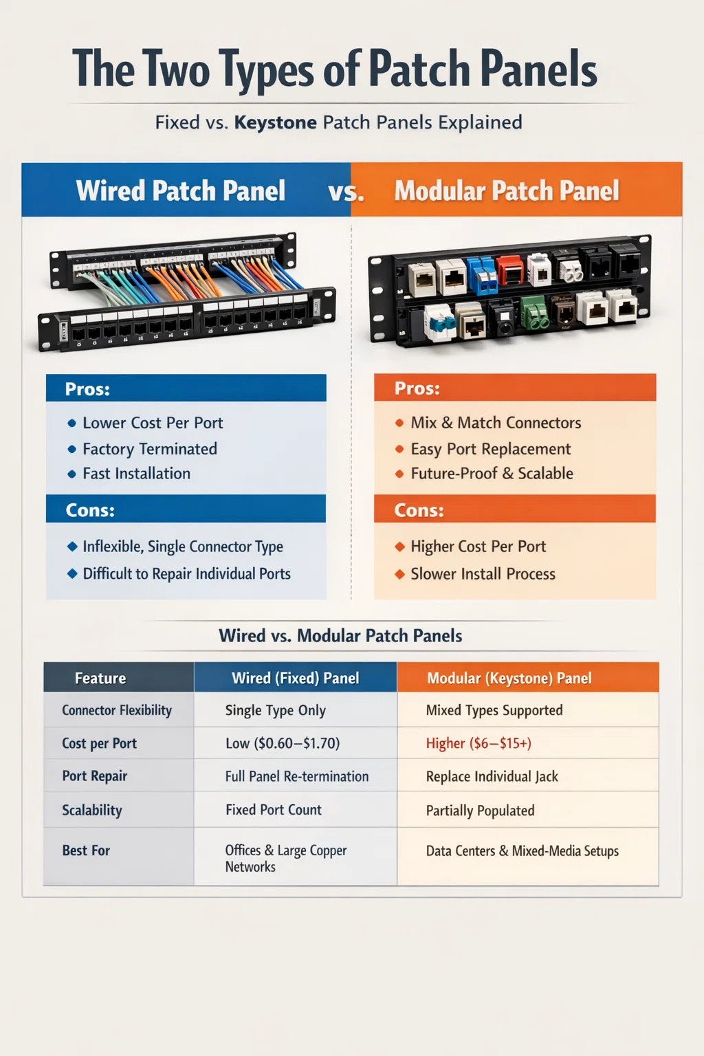 Ang dalawang pangunahing uri ng mga patch panel ay wired (fixed) patch panel at modular (keystone) patch panel . Ang dalawang kategoryang ito ang bumubuo sa pundasyon ng structured na paglalagay ng kable sa halos bawat data center, server room, at komersyal na pag-install ng network. Ang pag-unawa sa pagkakaiba sa pagitan ng mga ito ay mahalaga bago bumili ng isang patch panel ng network o pagdidisenyo ng isang layout ng paglalagay ng kable, dahil ang maling pagpili ay maaaring lumikha ng hindi kinakailangang gastos, inflexibility, o mga isyu sa pagganap.