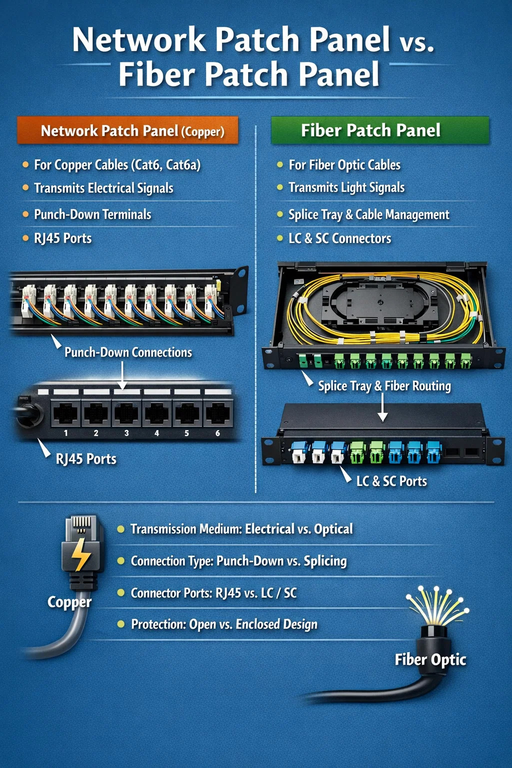 Panel ng Patch ng Network: Ito ay dinisenyo para sa mga copper cable (ibig sabihin, ang karaniwang ginagamit na Cat6 o Cat6a network cable). Ikinokonekta nito ang mga wire na tanso sa loob, na nagpapadala ng data sa pamamagitan ng mga pulso ng kuryente.